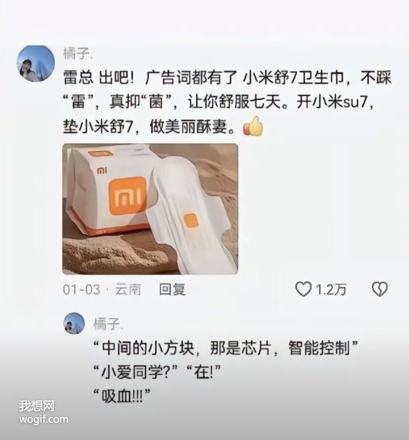 雷總 出吧!廣告詞都有了 小米舒7衛(wèi)生巾,不踩“雷”,真抑“菌”,讓你舒服七天。開小米su7,墊小米舒7,做美麗酥妻。