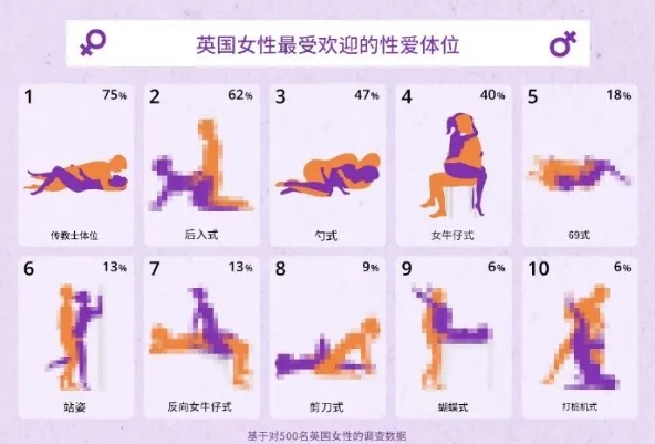 根據(jù)數(shù)據(jù)顯示:京東健康,提到女上位、后入式和傳教士式是國內(nèi)女性最愛的三種體位,而日本女性更喜歡嘗試不同體位,如側(cè)臥式、后入式,但未明確最偏好的體位。英國女性中 36% 偏好傳教士式,而男性中 25% 偏好狗爬式,當(dāng)然不同城市偏好不同,如倫敦偏好 “鷹式”(傳教士變種)。
